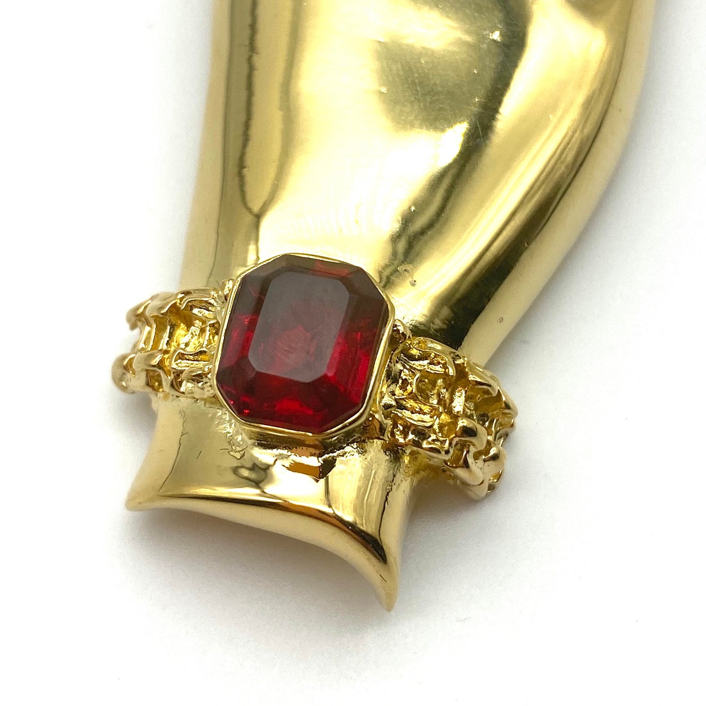 Made of smooth, shiny yellow gold tone metal the wrist is adorned with a wide bracelet and a large emerald cut faux ruby in the centre. There is also a golden ring on one finger, with a large princess cut faux ruby solitaire.