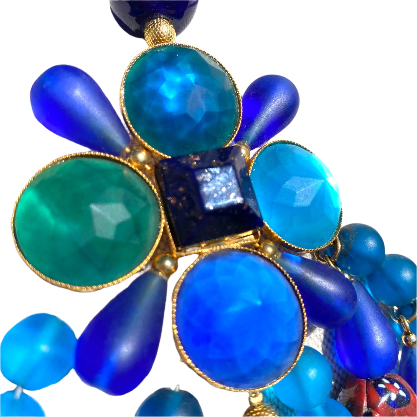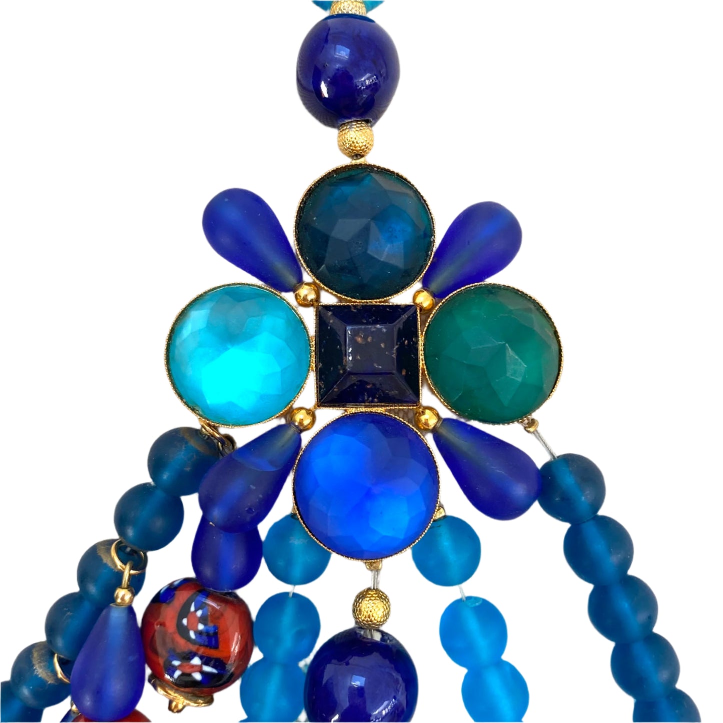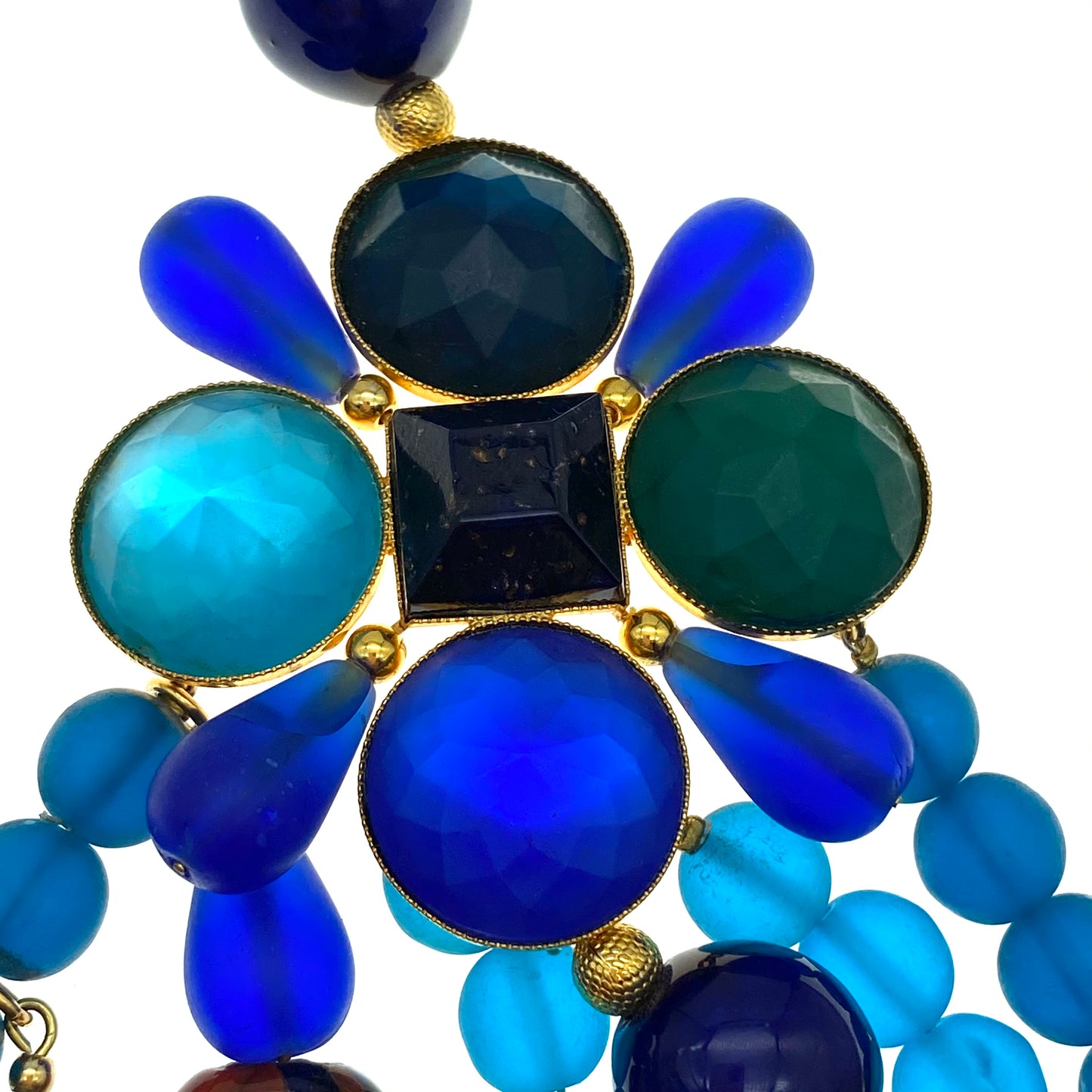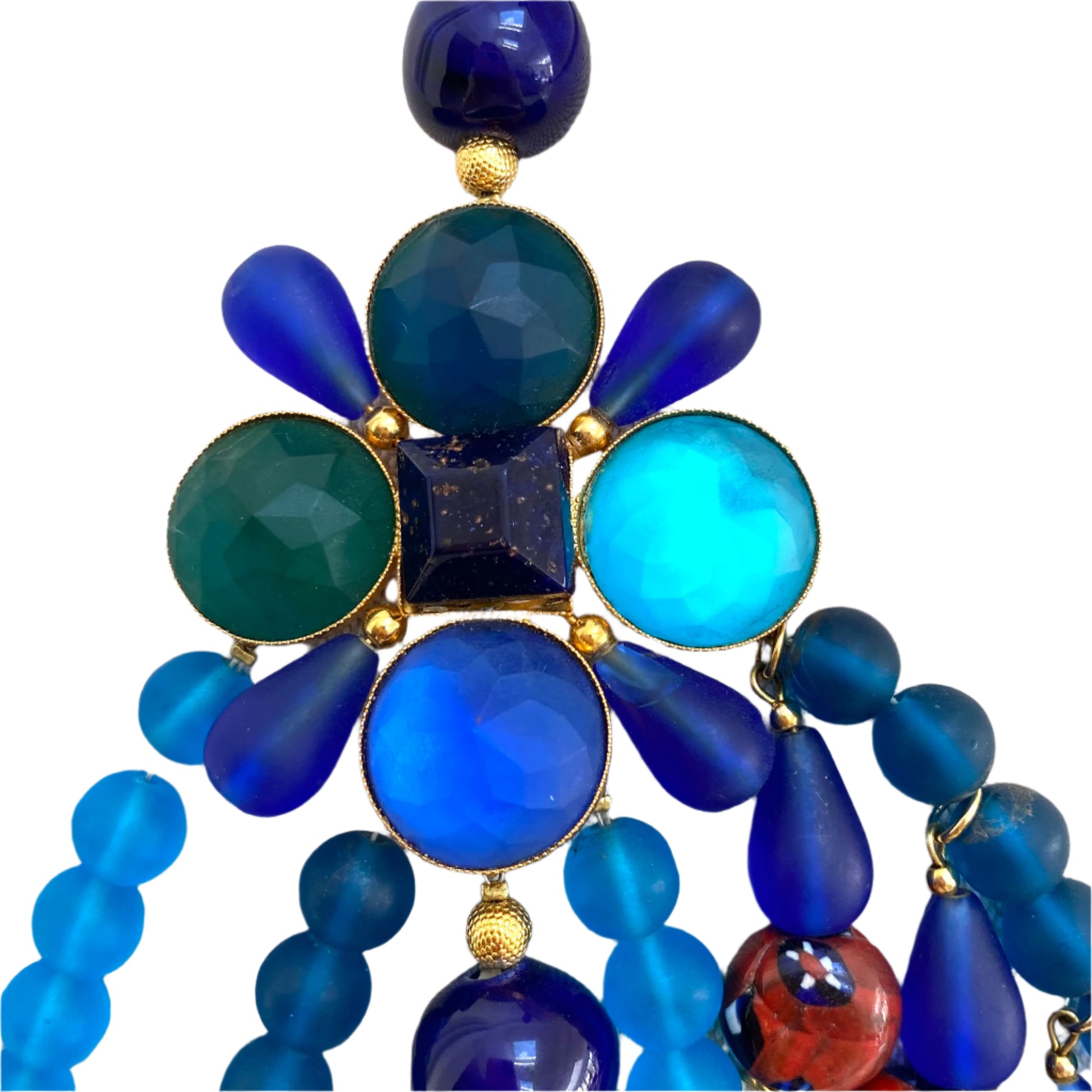 Designed as a cascading three strand necklace with two jewelled lengths (28cm & 35cm from below the Maltese crosses) falling down each side, all hanging on a coated twisted wire for durability and support. It features two Maltese crosses, which sit at the clavicles, and each centred with a square chamfered lapis lazuli stone (likely simulated, in deep blue), surrounded by four faceted luminous stones in vibrant blue, turquoise, teal and green, their tiny facets coming to a soft point with a frosted, matte surface, creating a soft, luminous glow, set into a closed backing, with four cobalt blue frosted teardrop beads positioned at angles in between. Elsewhere, the design includes back-to-back customised domed faceted stones (or possibly single double-sided pieces), set in thin 4mm bezel bands with foil backs to enhance their luminosity, alongside hand molded larger teardrop glass stones, translucent with a frosted, matte surface and luminous finish (possibly by Gripoix Paris or a Murano glassmaker), glossy millefiori glass beads (potentially sourced from Murano, Italy, each bead hand formed with varying shapes for a bespoke design), glazed ceramic painted beads, and unglazed ceramic painted beads, all contributing to YSL’s bohemian opulence. At the bottom of one side length, a double-sided, smooth, bulbous teardrop lapis lazuli bead (likely simulated) is bezel-set, while the other side length features a double-sided, frosted, luminous cobalt teardrop glass bead, also bulbous and bezel-set, each with additional double-sided faceted luminous stones above them in turquoise and vibrant blue, adding an asymmetrical appeal. The piece is accented with thin Etruscan discs and very thin 4mm bezel settings, formed around both teardrop and round faceted glass beads, in 22ct gold-plated metal, enhancing its luxurious appearance.