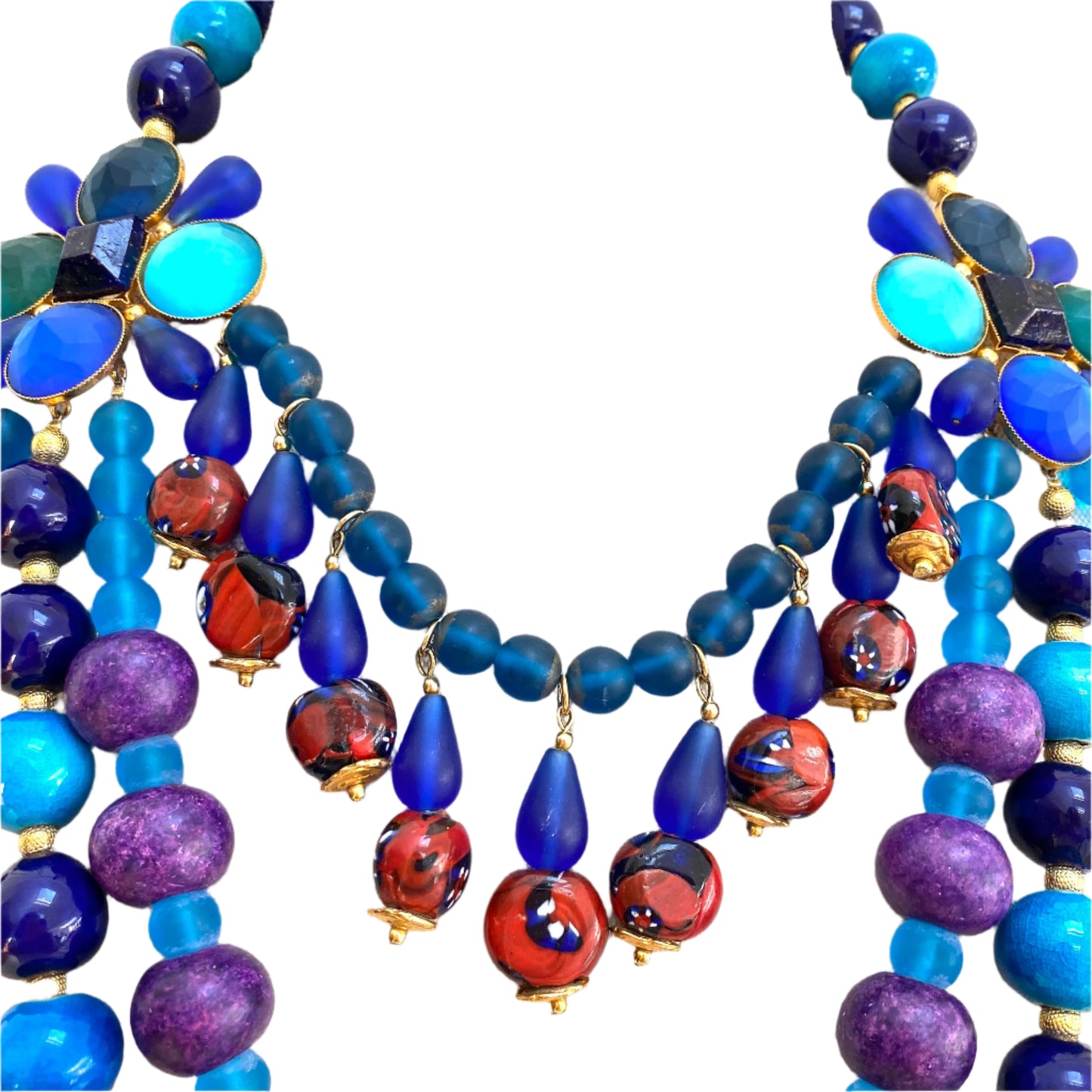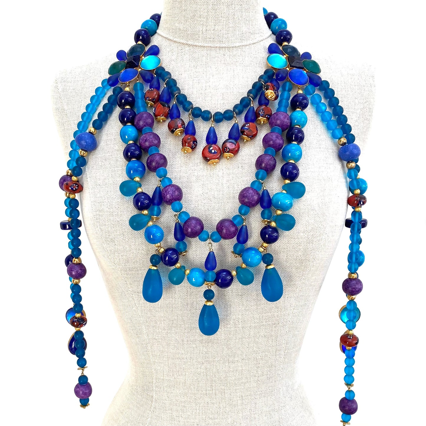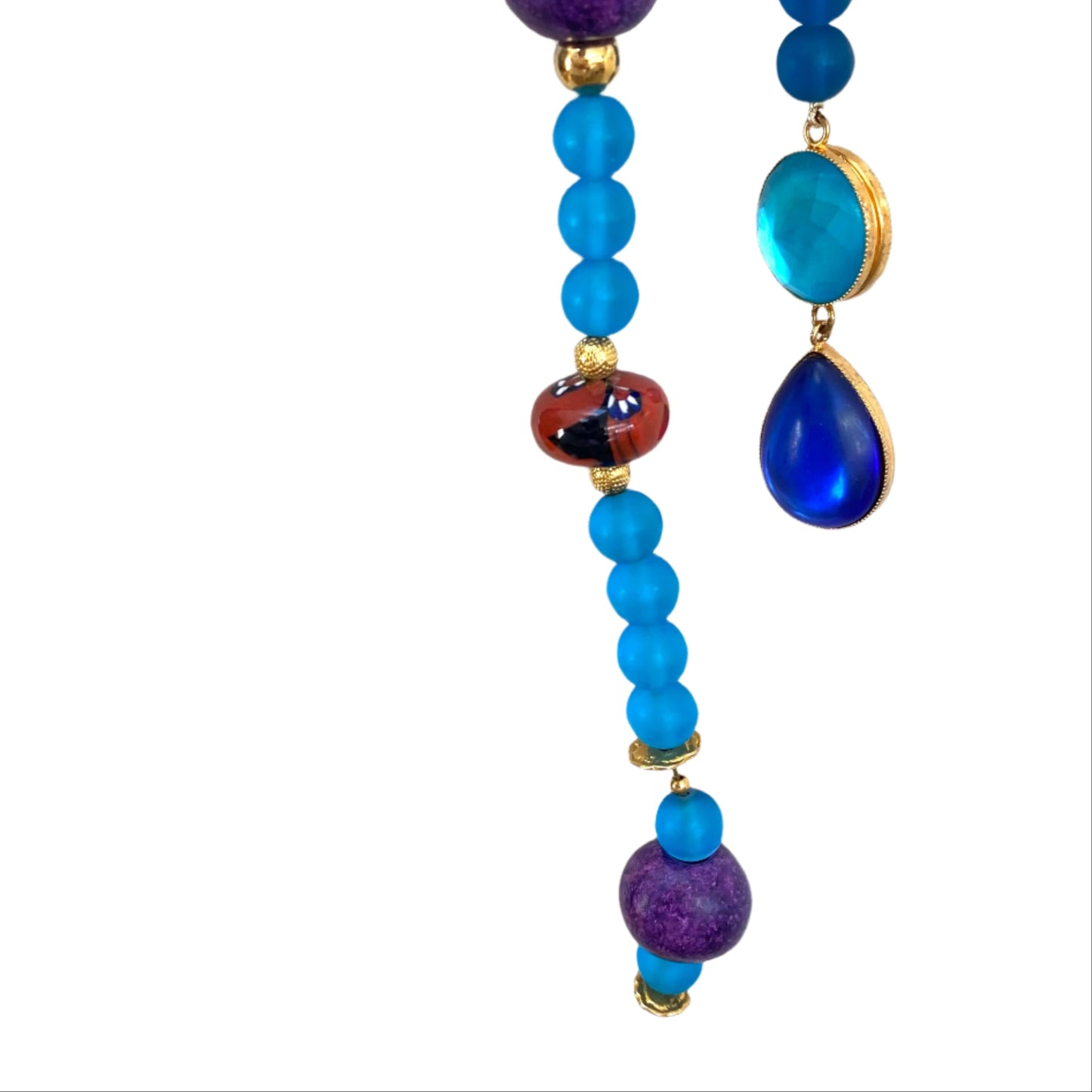 Designed as a cascading three strand necklace with two jewelled lengths (28cm & 35cm from below the Maltese crosses) falling down each side, all hanging on a coated twisted wire for durability and support. It features two Maltese crosses, which sit at the clavicles, and each centred with a square chamfered lapis lazuli stone (likely simulated, in deep blue), surrounded by four faceted luminous stones in vibrant blue, turquoise, teal and green, their tiny facets coming to a soft point with a frosted, matte surface, creating a soft, luminous glow, set into a closed backing, with four cobalt blue frosted teardrop beads positioned at angles in between. Elsewhere, the design includes back-to-back customised domed faceted stones (or possibly single double-sided pieces), set in thin 4mm bezel bands with foil backs to enhance their luminosity, alongside hand molded larger teardrop glass stones, translucent with a frosted, matte surface and luminous finish (possibly by Gripoix Paris or a Murano glassmaker), glossy millefiori glass beads (potentially sourced from Murano, Italy, each bead hand formed with varying shapes for a bespoke design), glazed ceramic painted beads, and unglazed ceramic painted beads, all contributing to YSL’s bohemian opulence. At the bottom of one side length, a double-sided, smooth, bulbous teardrop lapis lazuli bead (likely simulated) is bezel-set, while the other side length features a double-sided, frosted, luminous cobalt teardrop glass bead, also bulbous and bezel-set, each with additional double-sided faceted luminous stones above them in turquoise and vibrant blue, adding an asymmetrical appeal. The piece is accented with thin Etruscan discs and very thin 4mm bezel settings, formed around both teardrop and round faceted glass beads, in 22ct gold-plated metal, enhancing its luxurious appearance.