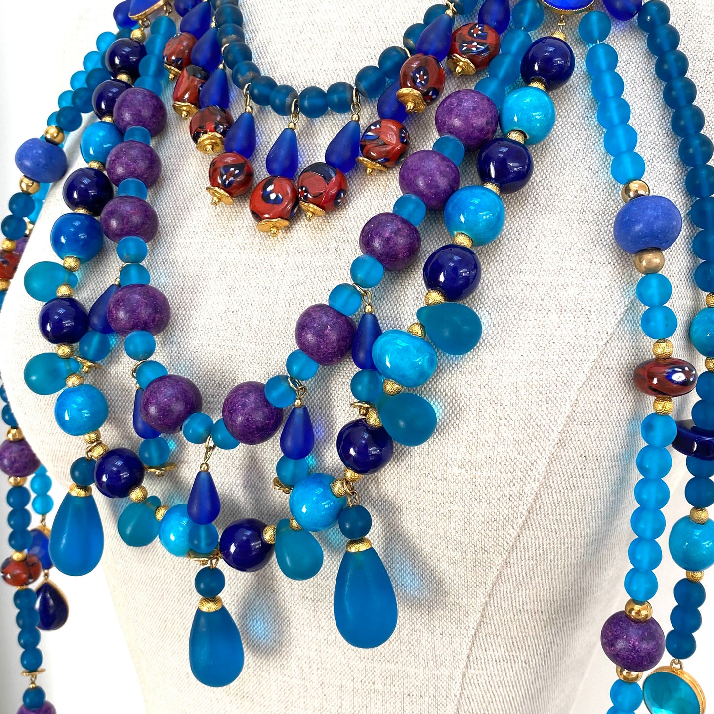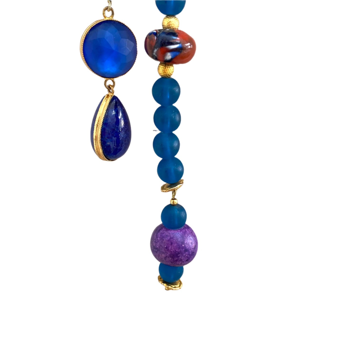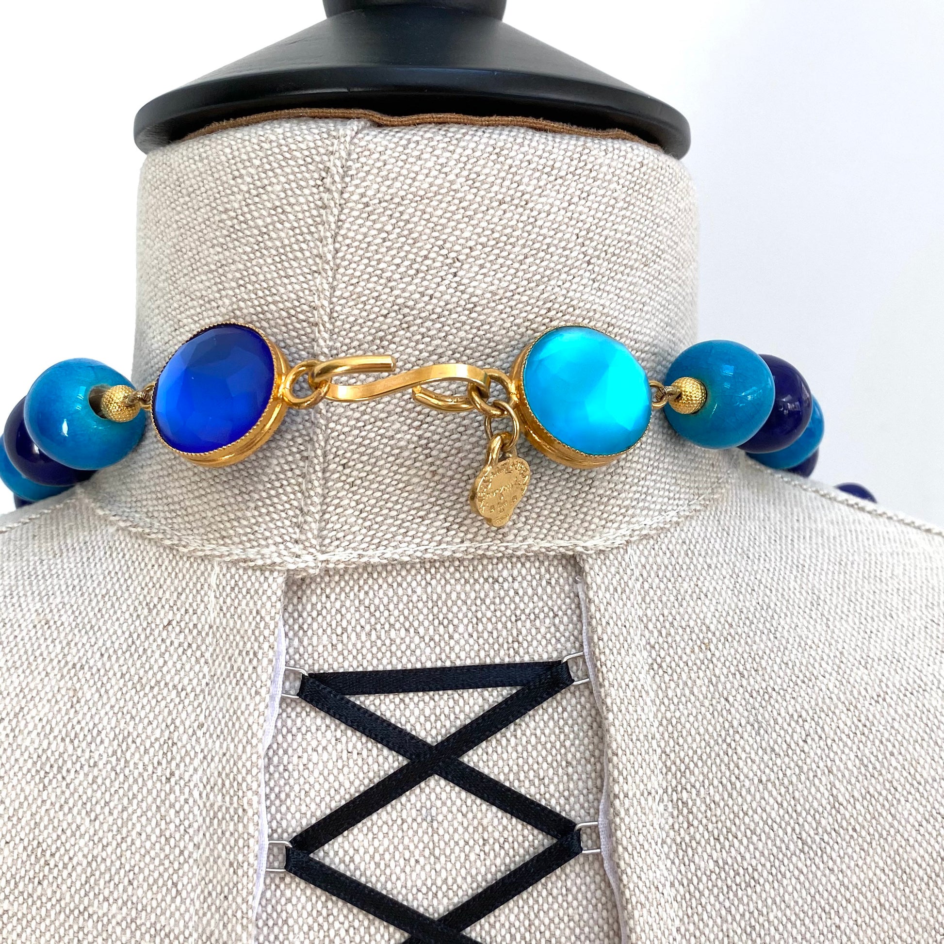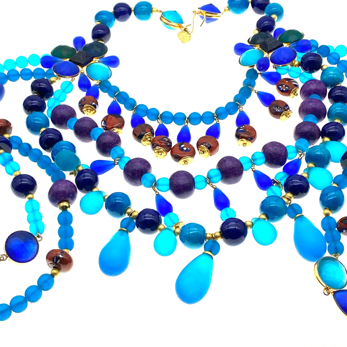 Designed as a cascading three strand necklace with two jewelled lengths (28cm & 35cm from below the Maltese crosses) falling down each side, all hanging on a coated twisted wire for durability and support. It features two Maltese crosses, which sit at the clavicles, and each centred with a square chamfered lapis lazuli stone (likely simulated, in deep blue), surrounded by four faceted luminous stones in vibrant blue, turquoise, teal and green, their tiny facets coming to a soft point with a frosted, matte surface, creating a soft, luminous glow, set into a closed backing, with four cobalt blue frosted teardrop beads positioned at angles in between. Elsewhere, the design includes back-to-back customised domed faceted stones (or possibly single double-sided pieces), set in thin 4mm bezel bands with foil backs to enhance their luminosity, alongside hand molded larger teardrop glass stones, translucent with a frosted, matte surface and luminous finish (possibly by Gripoix Paris or a Murano glassmaker), glossy millefiori glass beads (potentially sourced from Murano, Italy, each bead hand formed with varying shapes for a bespoke design), glazed ceramic painted beads, and unglazed ceramic painted beads, all contributing to YSL’s bohemian opulence. At the bottom of one side length, a double-sided, smooth, bulbous teardrop lapis lazuli bead (likely simulated) is bezel-set, while the other side length features a double-sided, frosted, luminous cobalt teardrop glass bead, also bulbous and bezel-set, each with additional double-sided faceted luminous stones above them in turquoise and vibrant blue, adding an asymmetrical appeal. The piece is accented with thin Etruscan discs and very thin 4mm bezel settings, formed around both teardrop and round faceted glass beads, in 22ct gold-plated metal, enhancing its luxurious appearance.