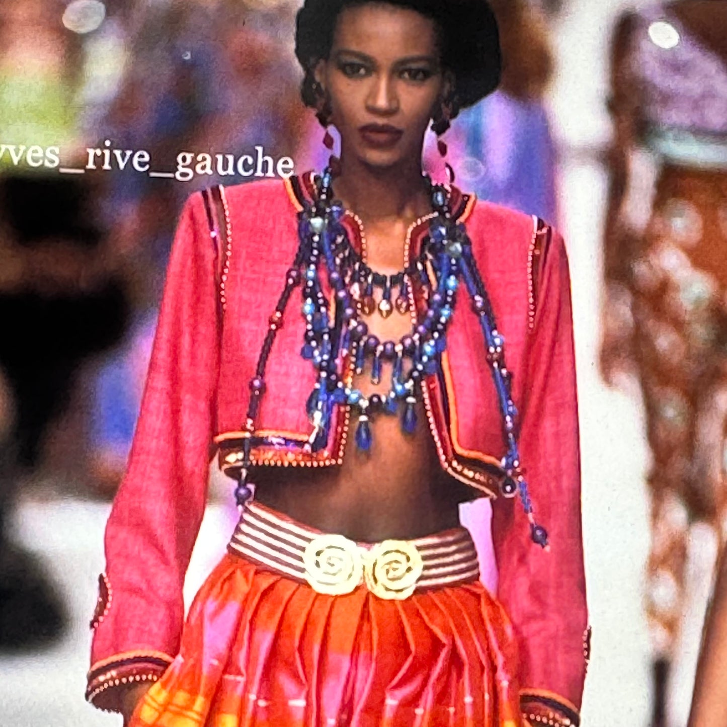 Runway photos by Guy Marineau from the S/S 1991 Rive Gauche show reveal four variations of this necklace design, each in distinct colourways: a red/brown version (worn by Carmen Schwarz), a red-orange-yellow-brown version (worn by Eleonore Klarwein), a aqua-yellow-pink-green version (worn by Yasmeen Ghauri), and a blue-purple version (worn by Amalia Vairelli, the closest to this piece). This necklace, a one-off with no identical examples documented or available for sale, brings the total to five variations, each in different colourways and with subtle changes in their bead arrangements, reinforcing the individuality of each necklace, likely created for the runway show and campaign. Magazine adverts from the same season, shot by Arthur Elgort, feature Yasmin Le Bon wearing the blue-purple version (which appears to match Amalia Vairelli’s runway variation), highlighting the design’s prominence in the S/S 1991 campaign. The five variations, possibly part of a small batch for the runway and campaign, underscore the piece’s rarity, with some potentially gifted to YSL insiders, further limiting their circulation.